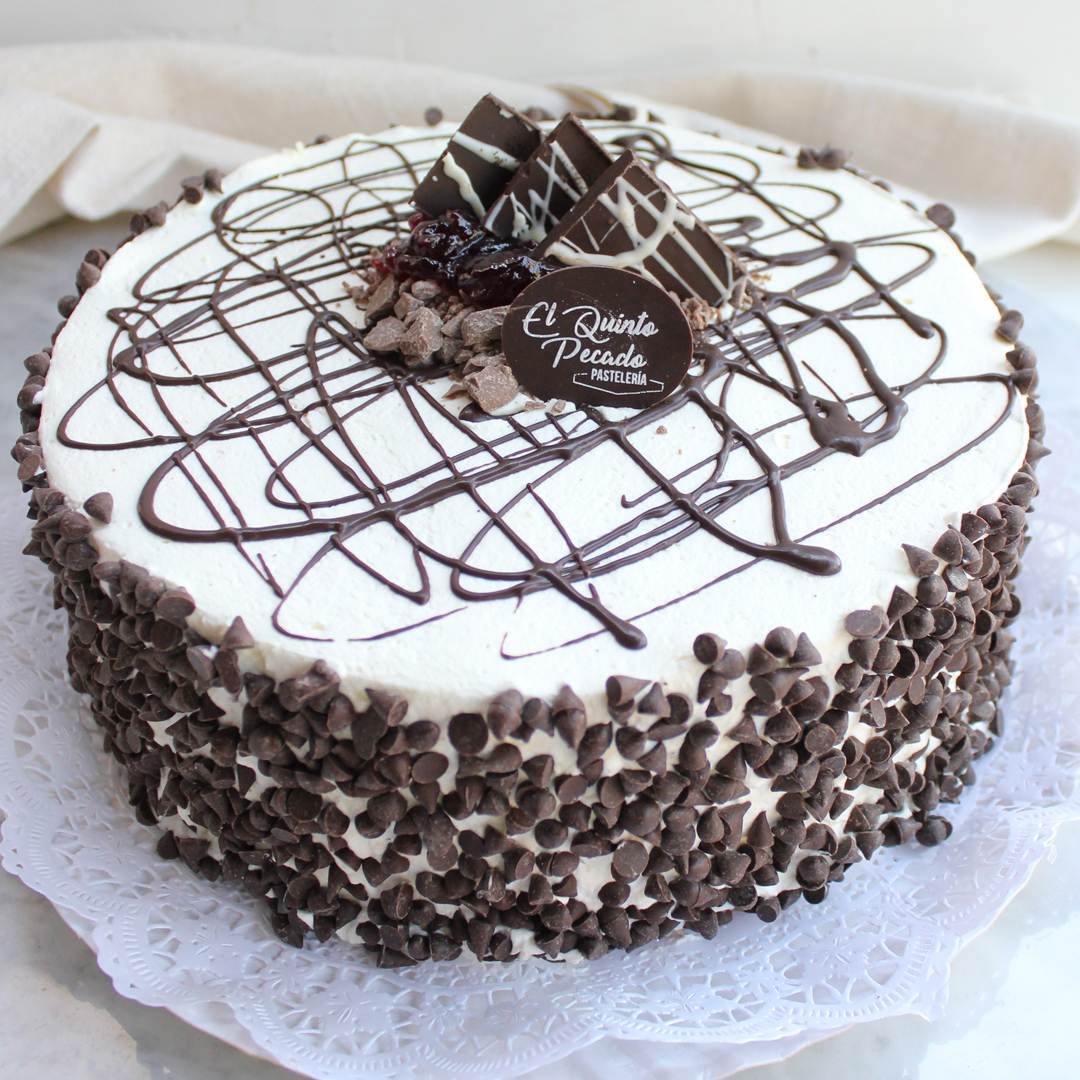 Bizcocho de chocolate, mermelada de guinda, crema chantilly, trocitos de chocolate.